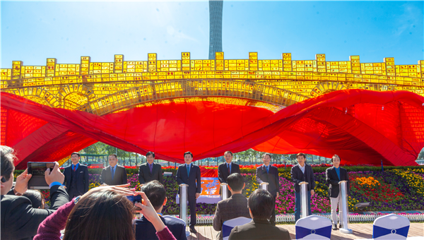 揭幕式最后,现场领导嘉宾一同为《丝路金桥》助力“读懂中国”揭幕,当鲜红的绸缎缓缓揭开,一座金光熠熠的《丝路金桥》与海心沙公园、广州塔和谐统一,他们一同在广州构筑出的新景观形态,为世人充分展现经济发展、文化繁荣、社会稳定、人民团结、山河秀美的东方大国形象,坚持和平发展、促进共同发展、维护国际公平正义、为人类作出贡献的负责任大国形象,可敬可爱可信的中国新时代景象,从而形成新时代融通中外的新概念新范畴新表述。
