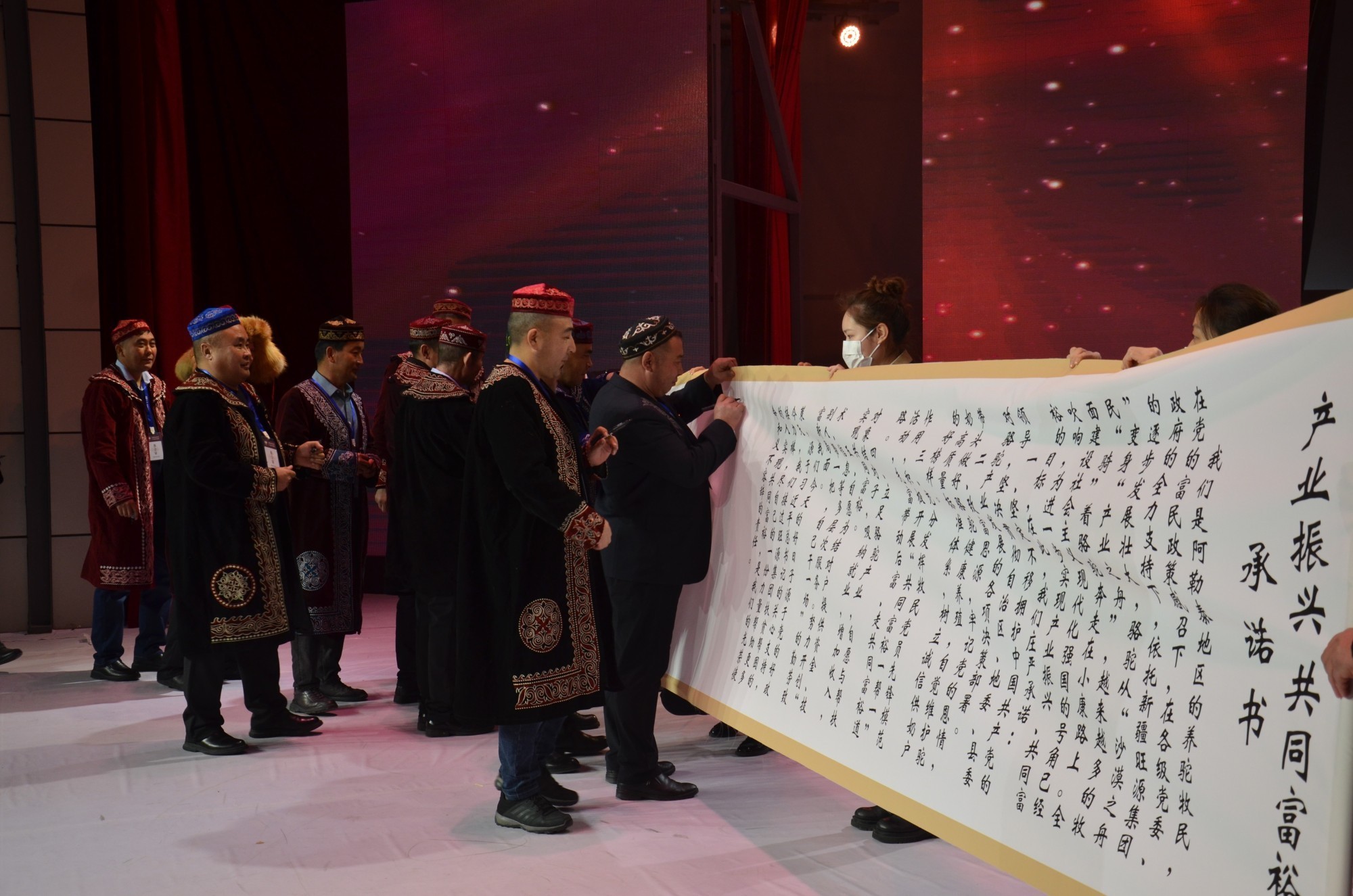 会上,养驼致富的牧民代表还集体签约“1+1”帮带承诺书,决心在龙头企业引领下带动周边更多农牧民养殖骆驼,为实现共同富裕、加快乡村振兴贡献力量。