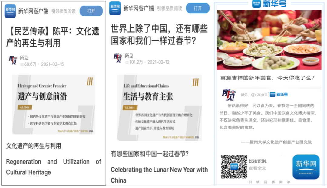 【实例8】:研究院与新媒体合作,传播中华优秀传统文化,普及有关民俗节庆、传统手工艺等知识。包括,受邀入驻新华网客户端,开设独立专栏,阅读量超过一千三百多万,受众广泛,成为传承传播中华优秀传统民俗文化的重要阵地;创建“民艺传承”微信公众号,相关内容被新华网客户端、文化和旅游部官方微信公众号等广泛转载,推动中国丰富文化遗产由资源向资本转换,助力中国传统工艺、艺术资源的传播发展。