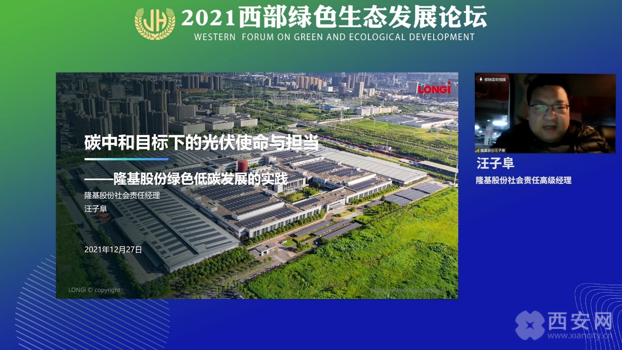 紧接着隆基股份社会责任经理汪子阜分享了《碳中和目标下的光伏使命与担当——隆基股份绿色低碳发展实践》,汪子阜表示光伏产业在过去十多年快速发展,已经成为全球多地最便宜的能源形式,也将在实现碳达峰碳中和目标中发挥巨大的作用。隆基股份作为光伏行业领先企业,在推进企业自身节能减排行动的同时,还积极携手供应链伙伴促进更大范围的绿色可持续发展,将践行零碳理念作为一种创新发展的战略,坚持从自身做起,设立高标准引领行业绿色发展。