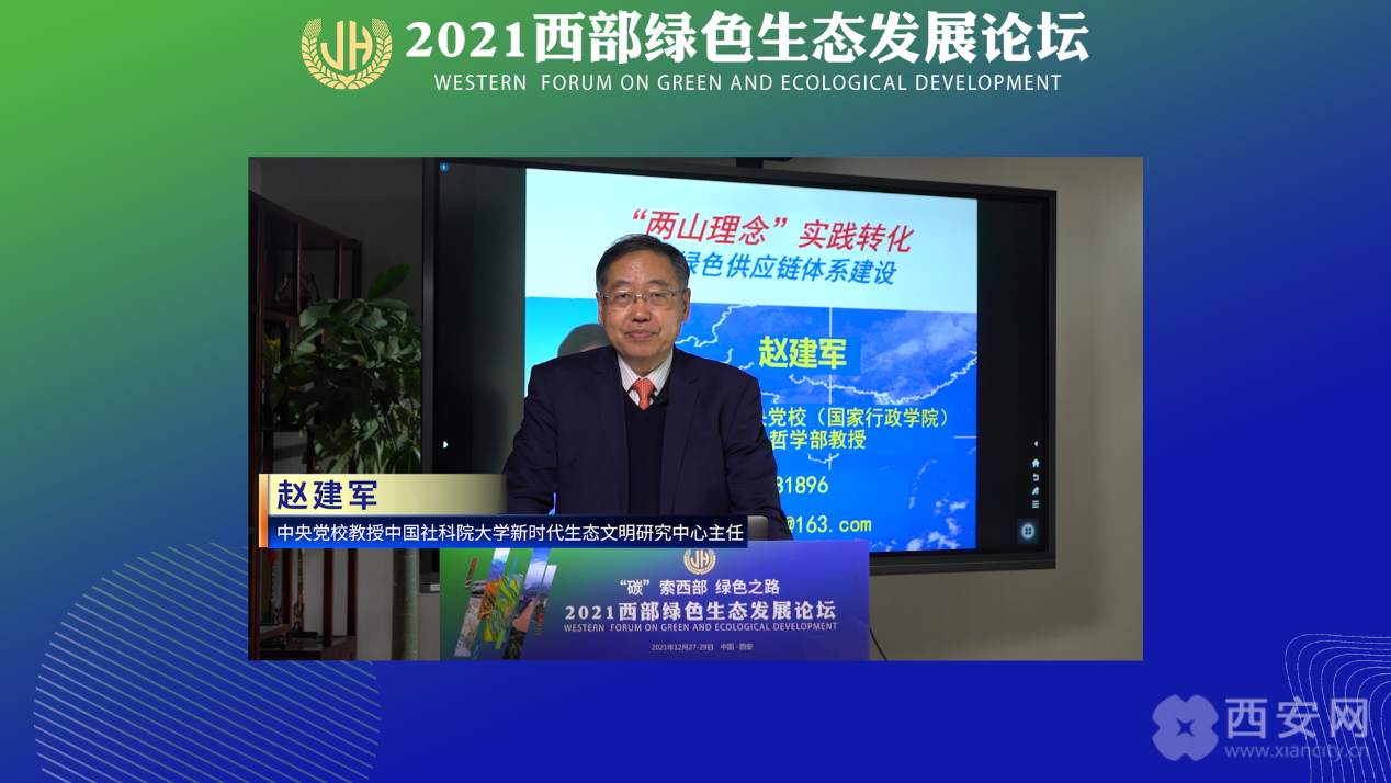 2021西部绿色生态发展论坛主论坛紧扣“‘碳’索西部、绿色之路”生态发展主题,中央党校教授中国社科院大学、新时代生态文明研究中心主任赵建军教授,为我们分享了《“两山理念”的实践转化与绿色供应链体系建设》,赵教授表示:绿色供应链体系需要整合资源,统一规划,整体布局,形成全产业链的协调配合。打造绿色供应链体系,打通“两山理念”转化落地的通道,为持续不断的金山银山建造生长的土壤。