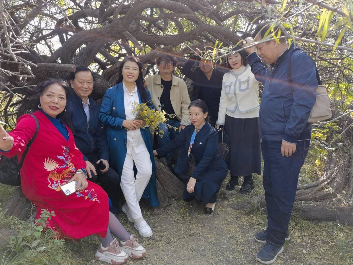 诗人在龙泉山庄千年汉盘龙柳茶树下合影