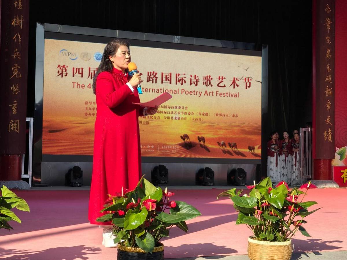 金秋十月,嵯峨山下,汉代池阳宫所在地,亦是丝绸之路的策源地陕西省泾阳县龙泉山庄,蓝天云白,泉水涌碧,金菊灿烂,丹柿红艳,第四届丝绸之路国际诗歌艺术节暨首届丝绸之路国际诗歌电影节在此隆重举行。来自全国各地的诗人代表和京陕的嘉宾:中国作家协会鲁迅文学院原常务副院长、著名作家白描,陕西省政府原副秘书长、陕西省诗词学会会长孟建国,陕西省文联原副主席、著名文化学者肖云儒,丝绸之路国际诗人联合会主席、《世界诗人》杂志总编王芳闻、《作家报》总编、著名作家张富英,著名诗人、评论家、澳门大学博士后、首都师范大学荒林教授,资深媒体人、《中国女人》系列纪录片总导演陈慧女士,世界诗歌运动协调员、丝绸之路国际诗人联合会执行主席、《大诗刊》杂志主编曹谁,丝绸之路国际诗人联合会执行主席、《世界诗人》杂志执行主编曹波,丝绸之路国际诗人联合会副主席、《世界诗人》杂志社社长张继征(香港),西安交通大学原文学院院长、博士生导师杨林,龙泉山庄董事长刘炜,获奖诗人代表李自国、东来、凌晓晨、丘树宏、张建军、范群、董发亮、陈杰、白浪、伏萍、韩渭平、边海云和朗诵艺术家以及当地群众约200人参加了盛会。组委会名誉主任由世界诗歌运动协调人费尔南多·伦德,联合国世界丝路论坛主席 Max Lu担任;评委会主任由中国诗歌学会副会长、著名诗歌评论家、首都师范大学教授、博士生导师、《诗探索》主编吴思敬担任。