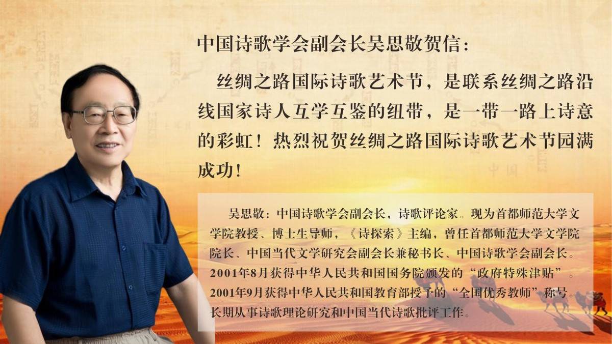 第四届丝绸之路国际诗歌艺术节评委会主任、中国诗歌学会副会长、《诗探索》主编吴思敬先生贺词